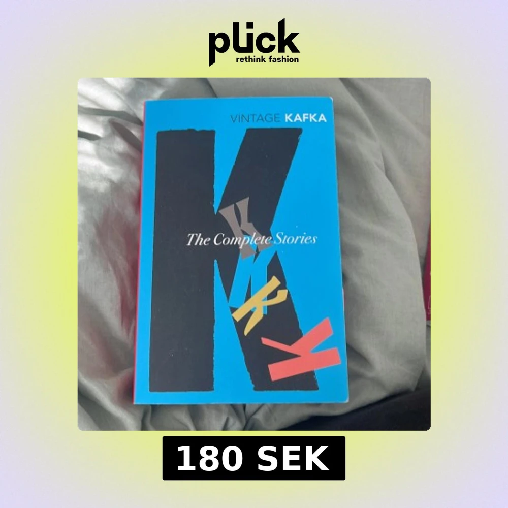 Säljer boken 'The Complete Stories' av Kafka, utgiven av Vintage. Omslaget är blått med en stor svart bokstav K och färgglada detaljer. Perfekt för dig som vill läsa alla Kafkas noveller samlade i en volym.
