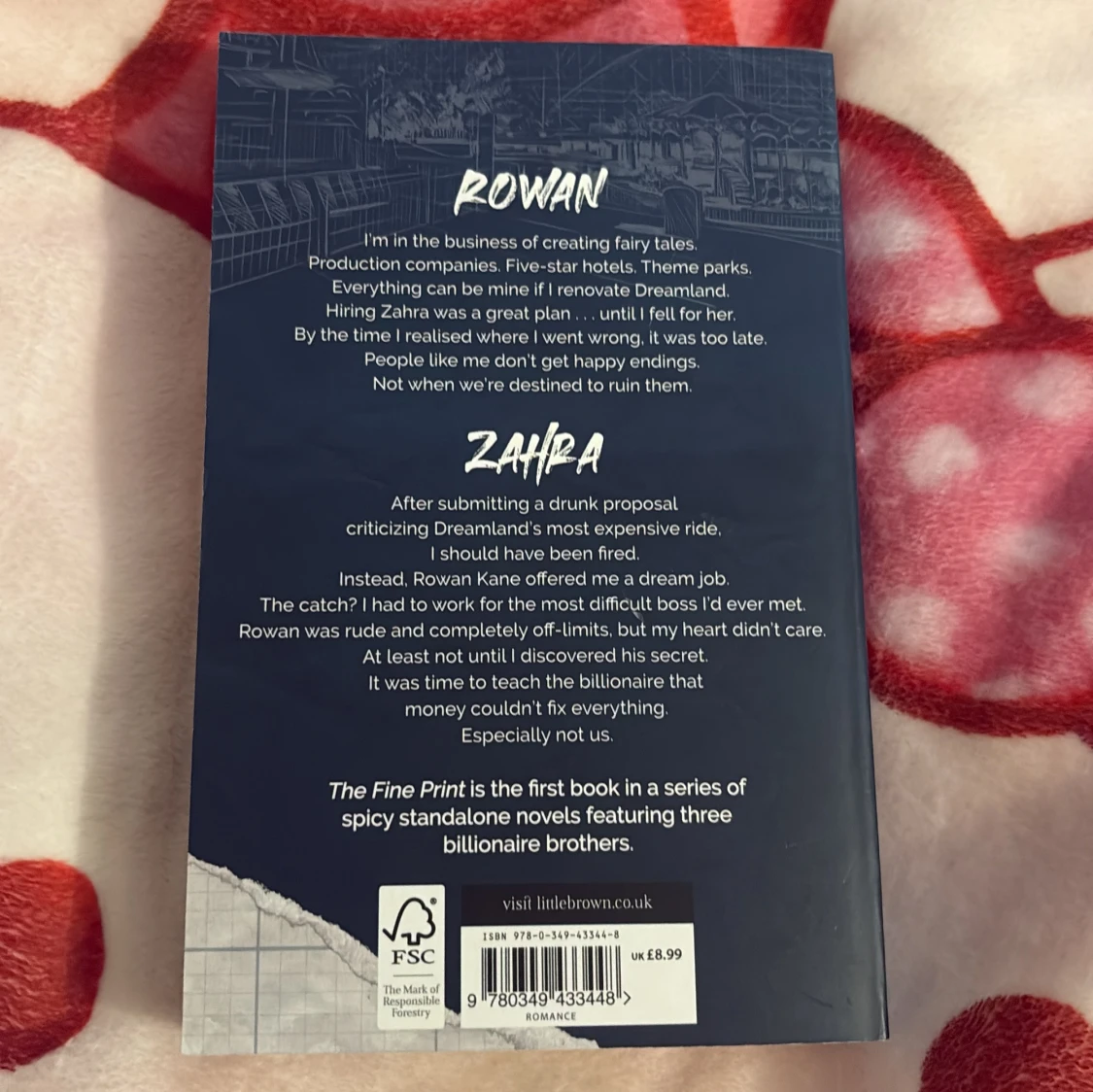 Boken 'The Fine Print' av Lauren Asher är den första i serien Dreamland Billionaires. Den handlar om Rowan och Zahra, där Rowan måste renovera Dreamland för att få sitt arv. Zahra får ett oväntat jobberbjudande efter att ha kritiserat en åkattraktion. En berättelse om makt, pengar och kärlek.