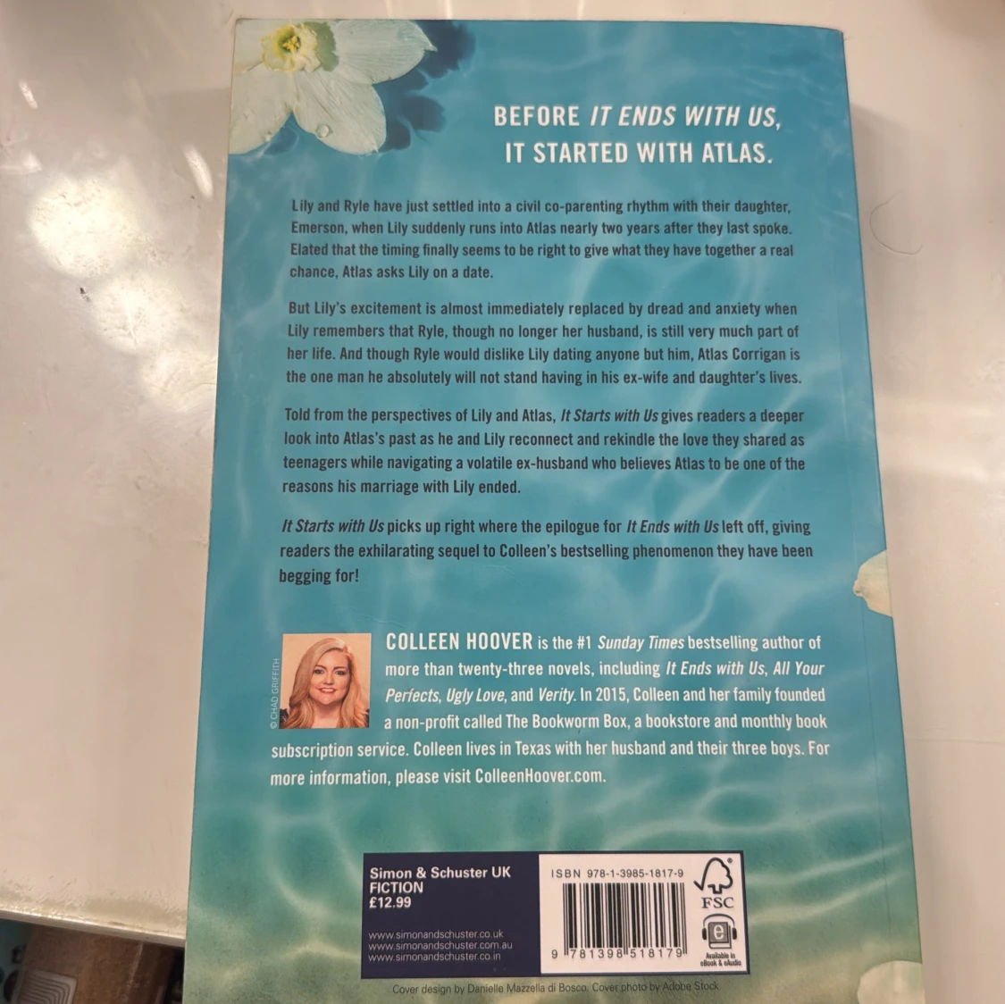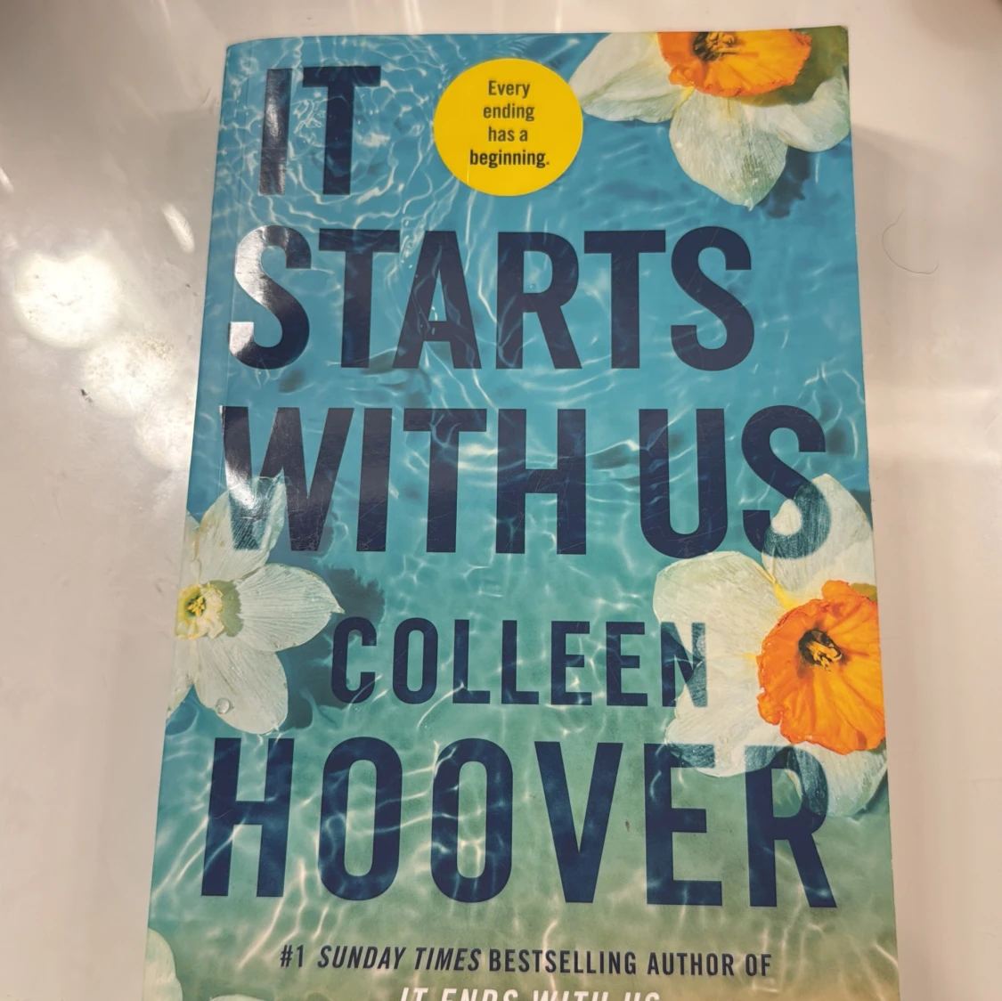 Boken 'It Starts With Us' av Colleen Hoover är en uppföljare som utforskar relationer och nya början. Omslaget har en blå bakgrund med blommor och texten 'Every ending has a beginning'. Perfekt för dig som gillar känslosamma och engagerande berättelser.