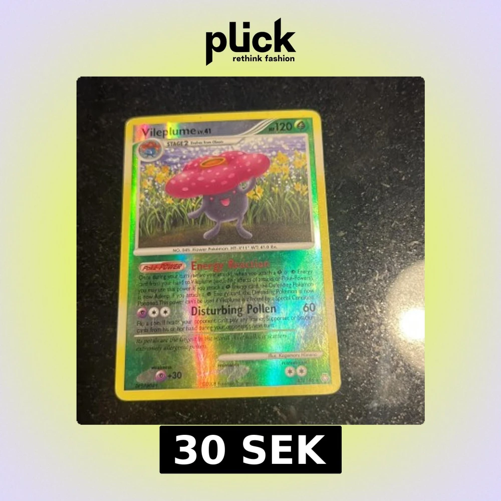 Detta är ett samlarkort från Pokémon-serien med Vileplume, en färgglad och glittrig holografisk design. Perfekt för dig som gillar Pokémon och vill utöka din samling med en klassisk karaktär från spelet och serien.