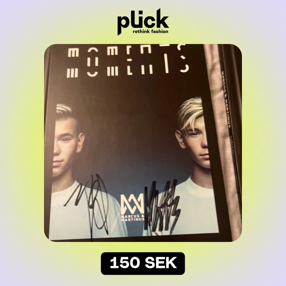 Säljer boken 'Moments' av Marcus & Martinus. Omslaget är svart med deras porträtt och titeln i vit text. Boken är signerad av båda artisterna, vilket gör den extra speciell för fans. Perfekt för samlare eller som present till någon som älskar deras musik!