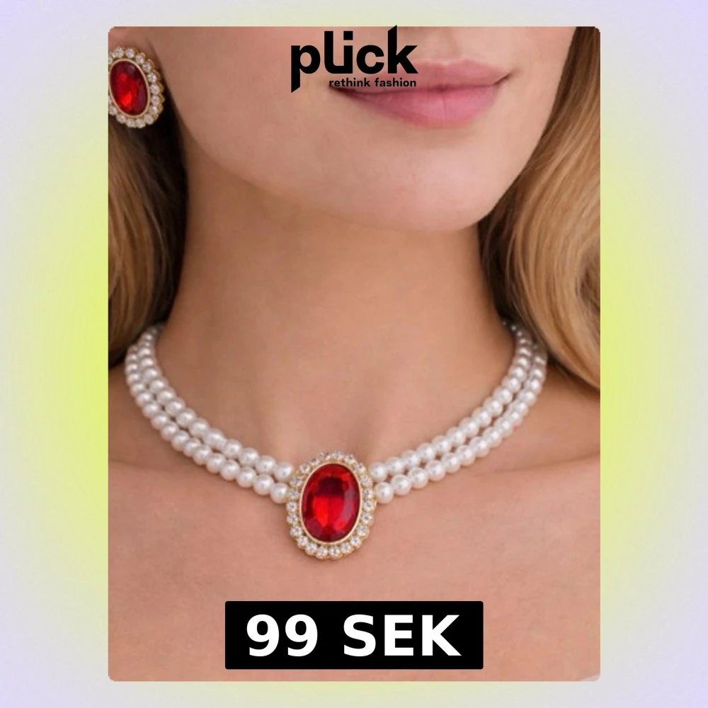 Säljer ett elegant set med choker och örhängen. Halsbandet har dubbla rader vita pärlor och ett stort rött smycke i mitten, inramat av små gnistrande stenar. Matchande örhängen med samma röda sten och pärldetaljer. Perfekt för att lyfta din outfit.