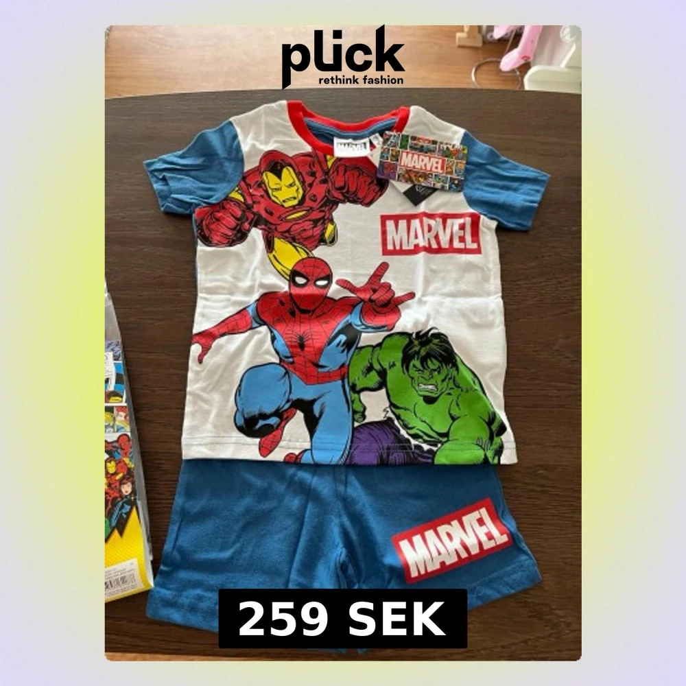 Snyggt Marvel set med t-shirt och shorts. T-shirten har tryck av Spiderman, Iron Man och Hulk i färgglada toner samt Marvel-logga. Blå ärmar och röd krage. Matchande blå shorts med Marvel-logga på benet. Perfekt för alla superhjältefans!