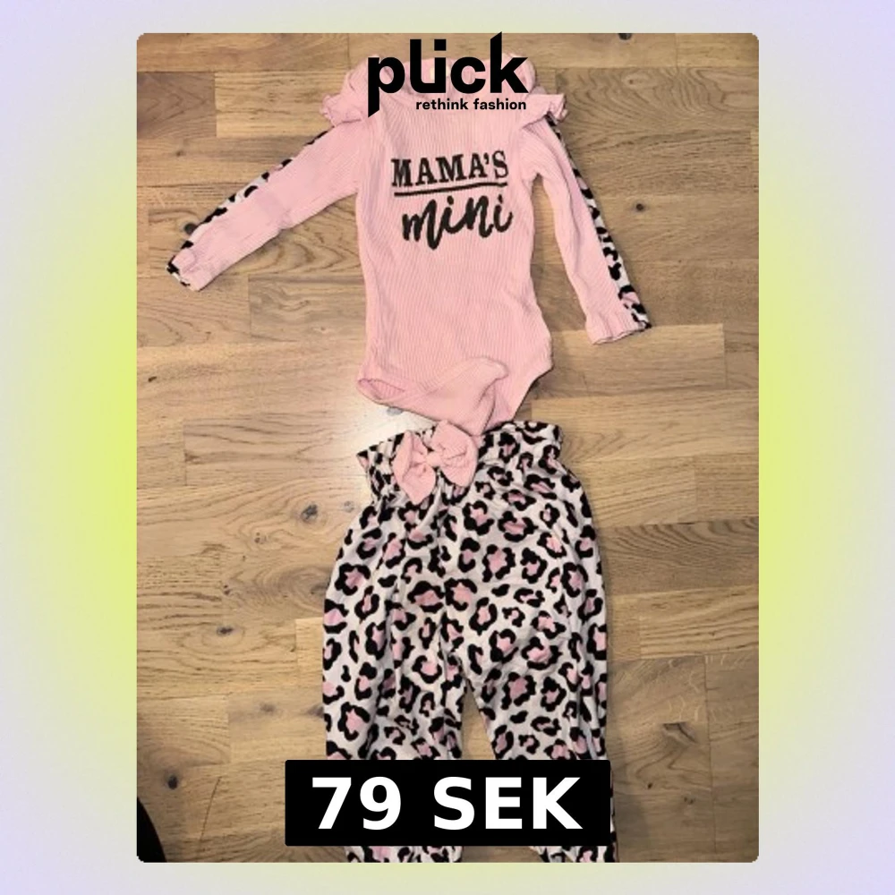 Sött set med rosa ribbad body med texten 'MAMA'S mini' och volangdetaljer på axlarna. Tillhörande byxor i rosa med svart och brun leopardmönster samt matchande rosett. Perfekt för en trendig liten tjej.