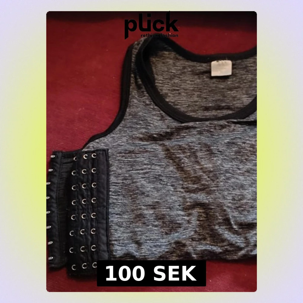 Snygg gråmelerad binder med svarta kanter och breda axelband. Den har stretchigt material som känns bekvämt mot huden.