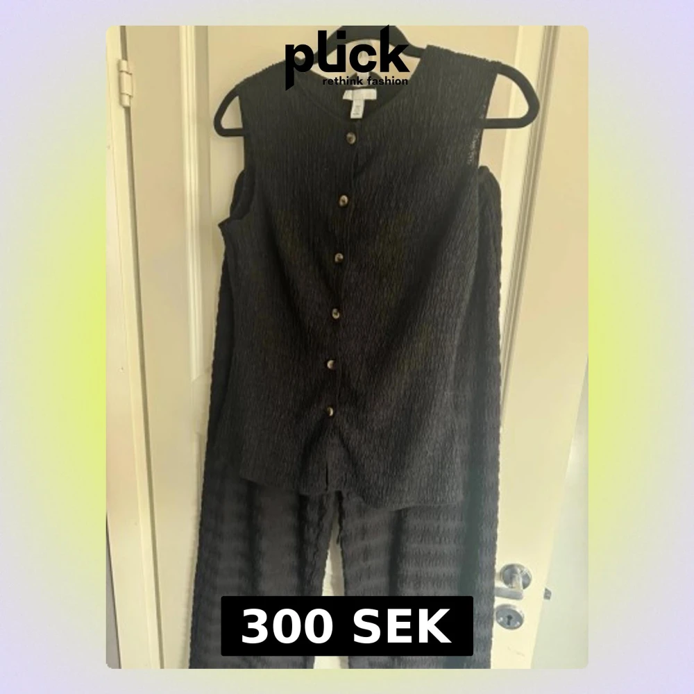 Säljer ett svart set från med strukturerat tyg. Toppen är ärmlös med rund halsringning och knappar framtill. Byxorna är vida och har liknande material. Är man intresserad av endast ett plagg kan man skriva till mig. Vesten är i storlek S och byxorna är i storlek M.