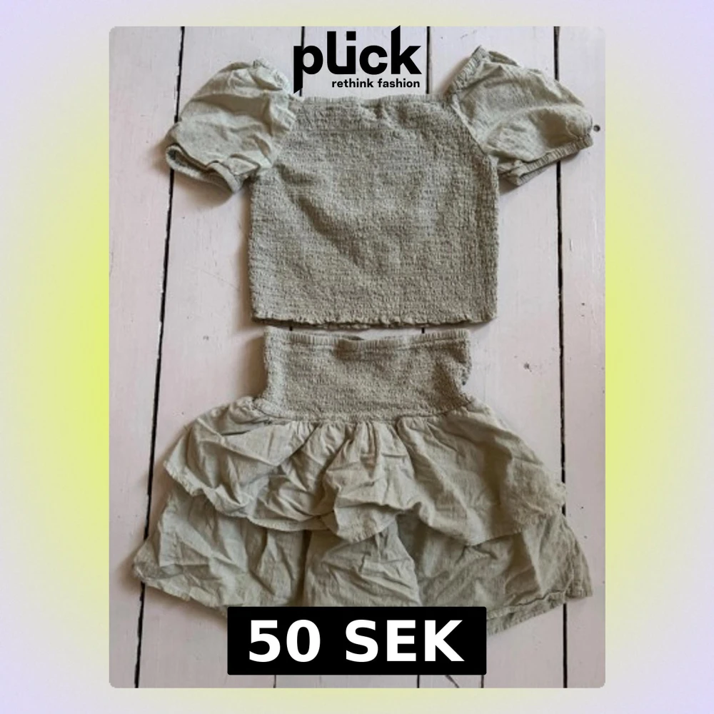 Säljer ett ljusgrönt tvådelat set med puffärmar och smockdetaljer. Toppen har korta puffärmar och smockad kropp, medan kjolen har bred smock i midjan och dubbla volanger. Setet är gjort i ett mjukt, tunt tyg som ger en avslappnad look.