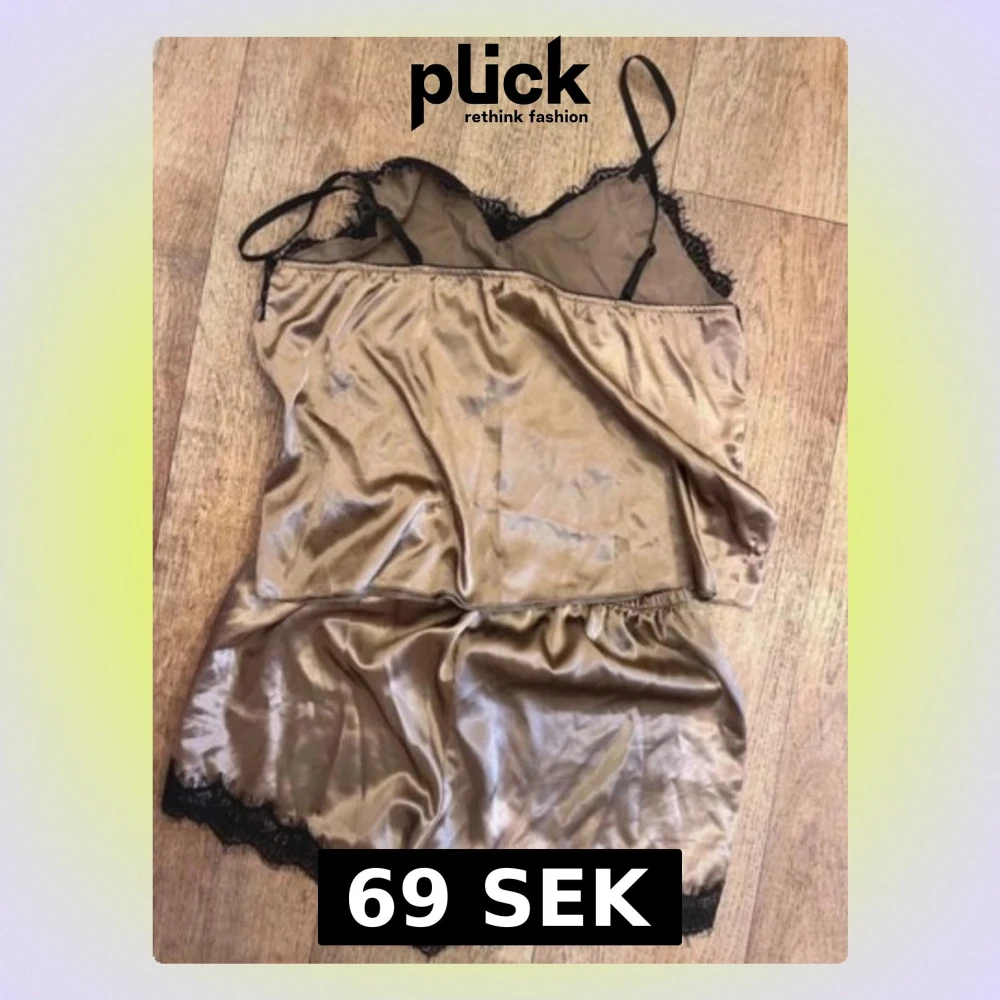 Snyggt tvådelat pyjamasset i glansigt beige material med svarta spetsdetaljer. Setet består av ett linne med tunna axelband och V-ringning samt matchande shorts med elastisk midja. Perfekt för en lyxig känsla hemma.