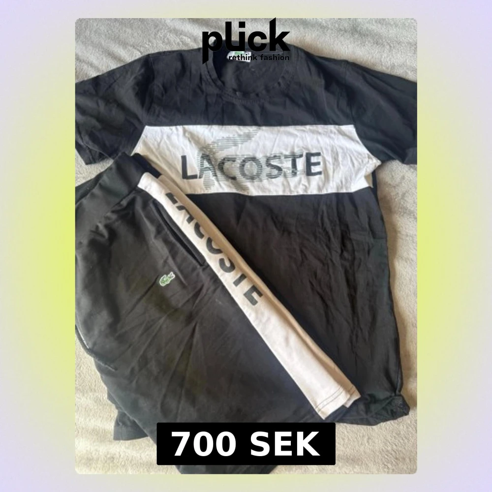 Snyggt set från Lacoste med svart och vit t-shirt och matchande shorts. T-shirten har en bred vit panel med Lacoste-logga över bröstet och krokodilmärke på ärmen. Shortsen är svarta med vit sidopanel och Lacoste-tryck samt krokodillogo. Perfekt för en sportig look.