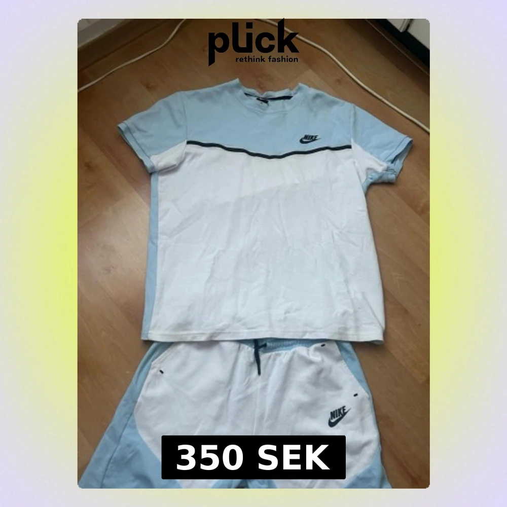 Säljer ett snyggt tvådelat set från Nike med t-shirt och shorts i ljusblått och vitt. T-shirten har svart Nike-logga och en svart linje över bröstet, medan shortsen har dragsko i midjan och matchande logga. Perfekt för en sportig och avslappnad stil. Kan ha fläckar men kan enkelt gå bort av en tvätt