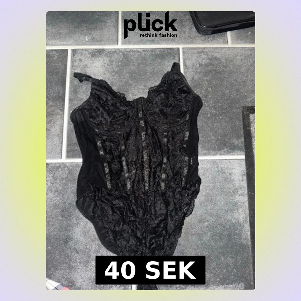 Snygg svart body i spets med tunna axelband och dekorativa banddetaljer framtill. Bodyn har en feminin form och genombrutna spetsmönster som ger en lyxig känsla. Perfekt för dig som vill ha något extra under kläderna. (för liten för mig, aldrig använd)