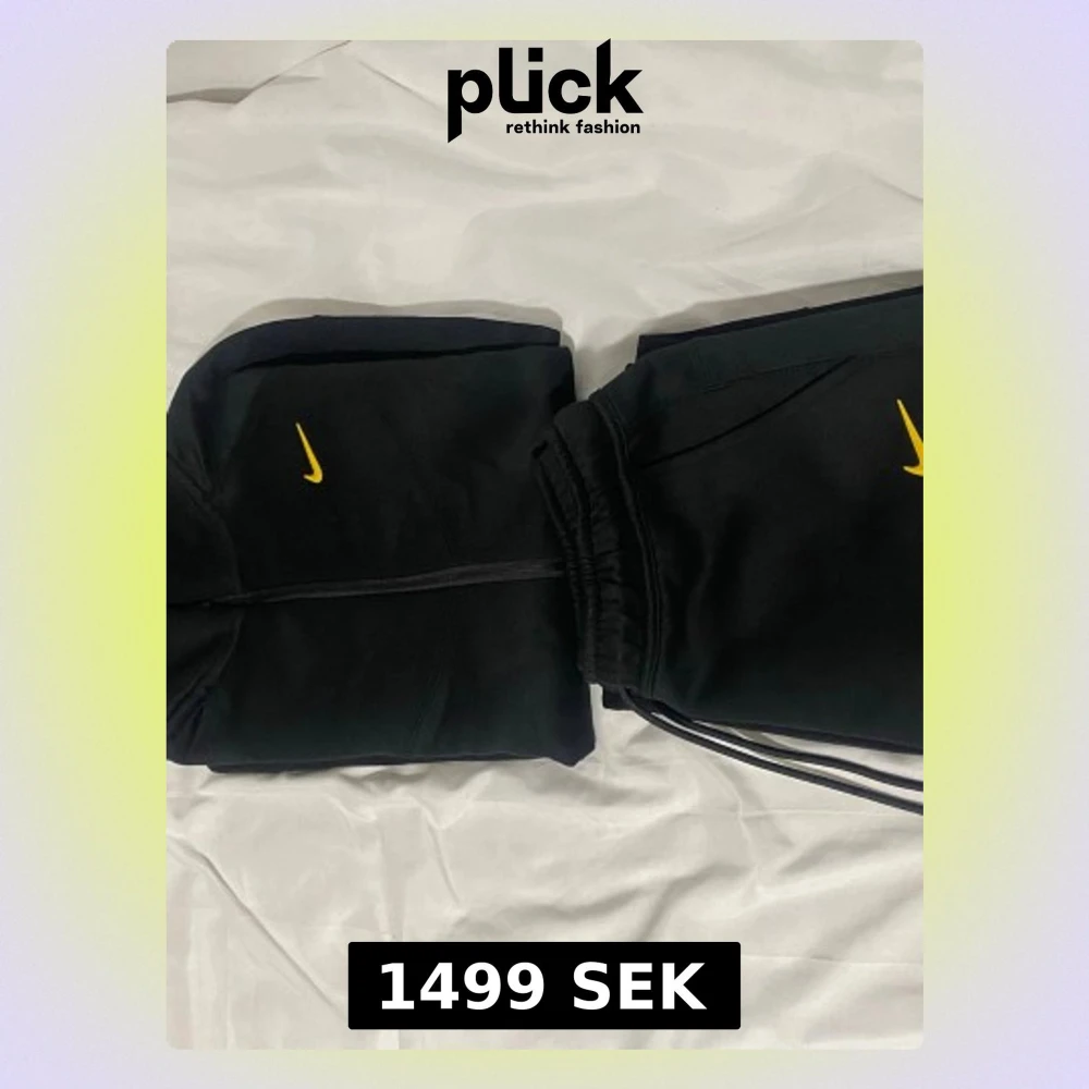 Säljer ett svart set från Nike NOCTA med gul logga. Setet består av en hoodie med dragkedja och matchande joggers med NOCTA-tryck på benet. Materialet är mjukt och bekvämt, perfekt för en avslappnad look. Både hoodie och byxor har diskreta detaljer och snygg passform.