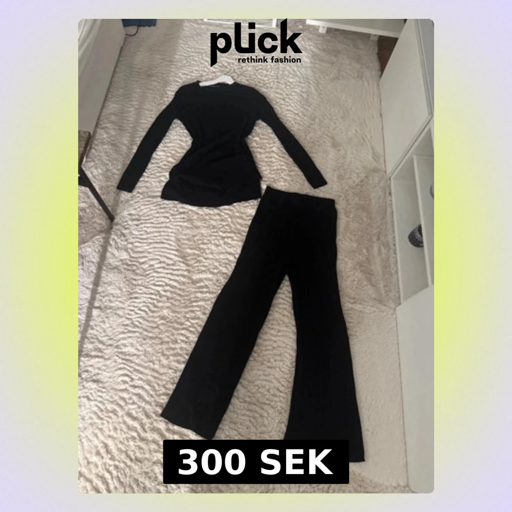 Säljer ett svart ribbat set från LC Wakiki med långärmad topp och matchande byxor. Setet har en fin passform och är gjort i ett mjukt, stretchigt material som känns skönt mot huden. Tröjan har en fin slits som jag själv älskar och tycker är jätte fint. Perfekt för dig som gillar en stilren och enkel look.