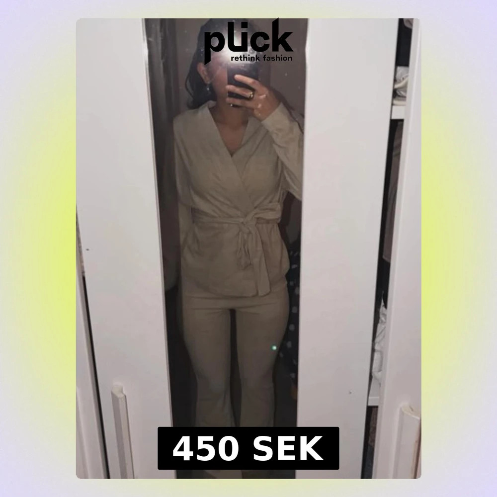 Snyggt tvådelat set från Cider i beige färg. Setet består av en omlottopp med knytband i midjan och matchande byxor med utsvängda ben. Mjukt och stretchigt material som sitter bekvämt och ger en stilren look. Pluss en linne som är under koftan ingår. Prislapp med helt nya.