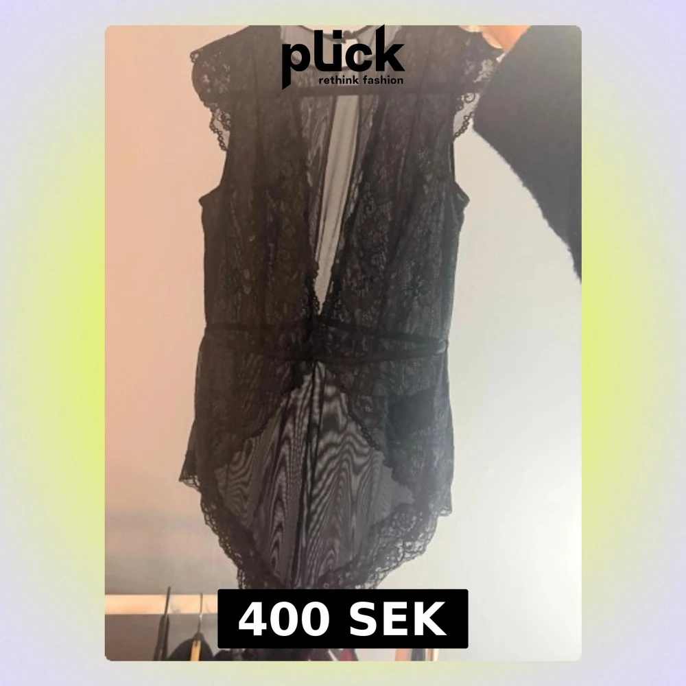 Säljer en jättefin svart body i transparent mesh med vackra spetsdetaljer och djup v-ringning. Modellen är ärmlös med dekorativa kanter och knäpps i nacken. Perfekt för dig som vill ha något extra till din outfit.