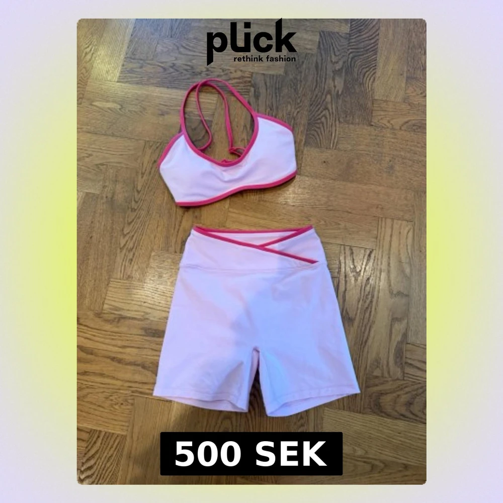Säljer ett snyggt tvådelat bodyset i ljusrosa med kontrasterande rosa kantband. Setet består av en sportig crop top med tunna axelband och matchande shorts med omlott-detalj i midjan. Perfekt för dig som gillar en sportig och trendig look.