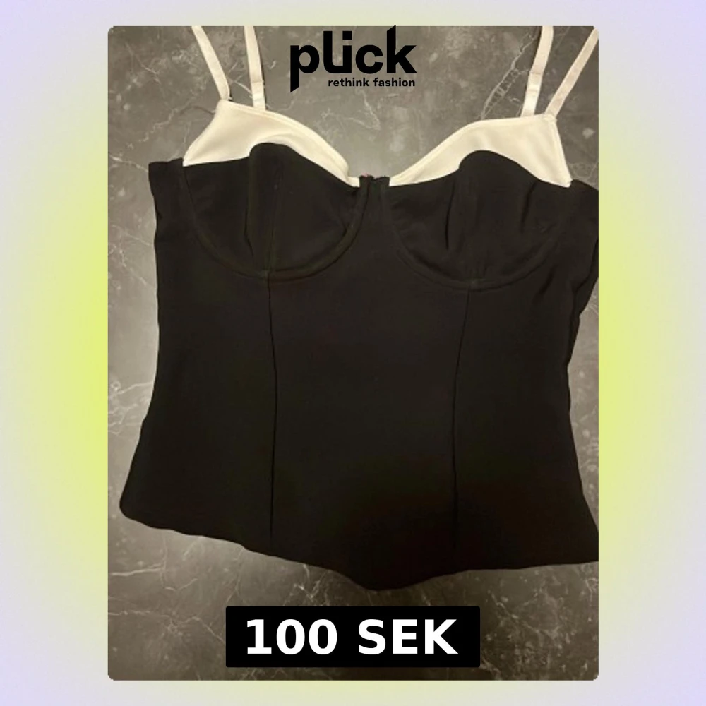 Snygg korsettinspirerad topp med svarta kupor och kropp samt vita detaljer upptill och vita justerbara axelband. Toppen har bygel för extra stöd och en figurnära passform. Perfekt att styla med jeans eller kjol för en trendig look.