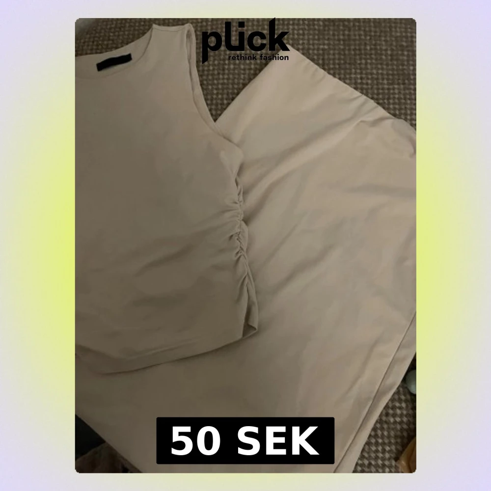 Säljer ett stilrent beige bodyset med ärmlös topp och matchande underdel. Toppen har rynkade detaljer på sidan för en snygg passform. Setet är tillverkat i ett mjukt och stretchigt material som känns bekvämt mot huden. Perfekt för dig som gillar minimalistisk och trendig stil.