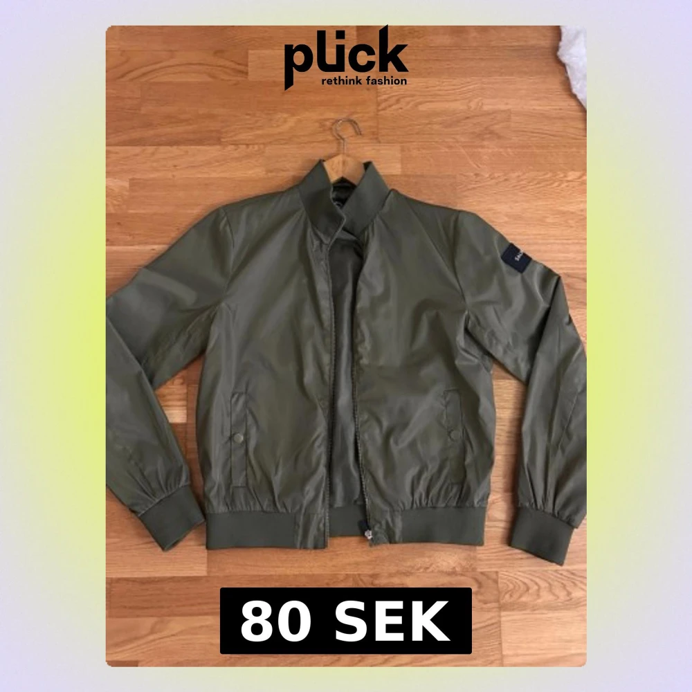 Snygg olivgrön bomberjacka med dragkedja framtill, ribbade muddar och krage. Jackan har två fickor med tryckknappar och en liten patch på ärmen. Tillverkad i ett slätt, lätt material som ger en clean look.
