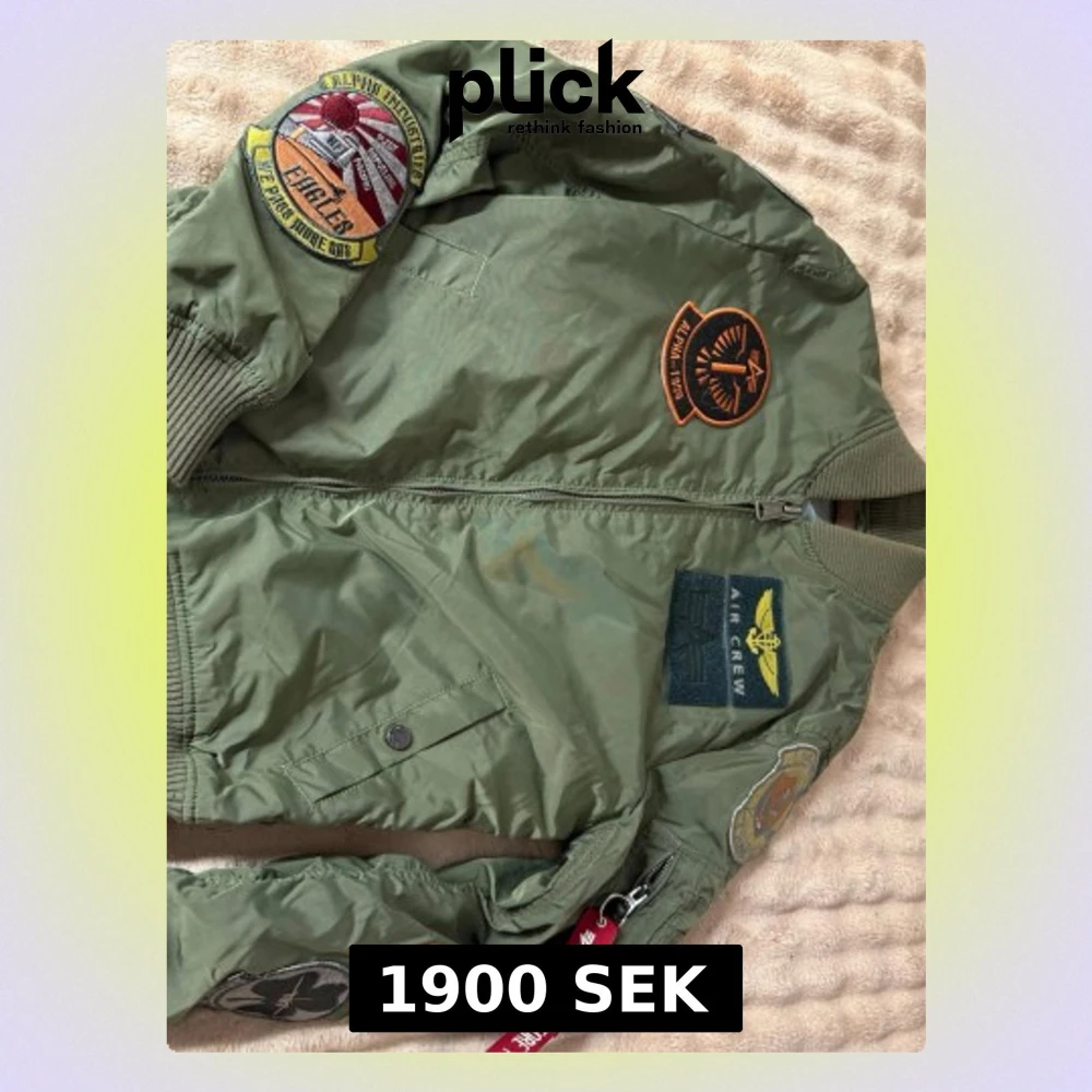 Säljer en grön bomberjacka från Alpha Industries i storlek medium. Jackan har flera coola tygmärken och patchar, orange innerfoder och klassisk utility-ficka på ärmen med röd 'Remove Before Flight'-tag. Tillverkad i slitstark nylon med ribbade muddar och dragkedja framtill.