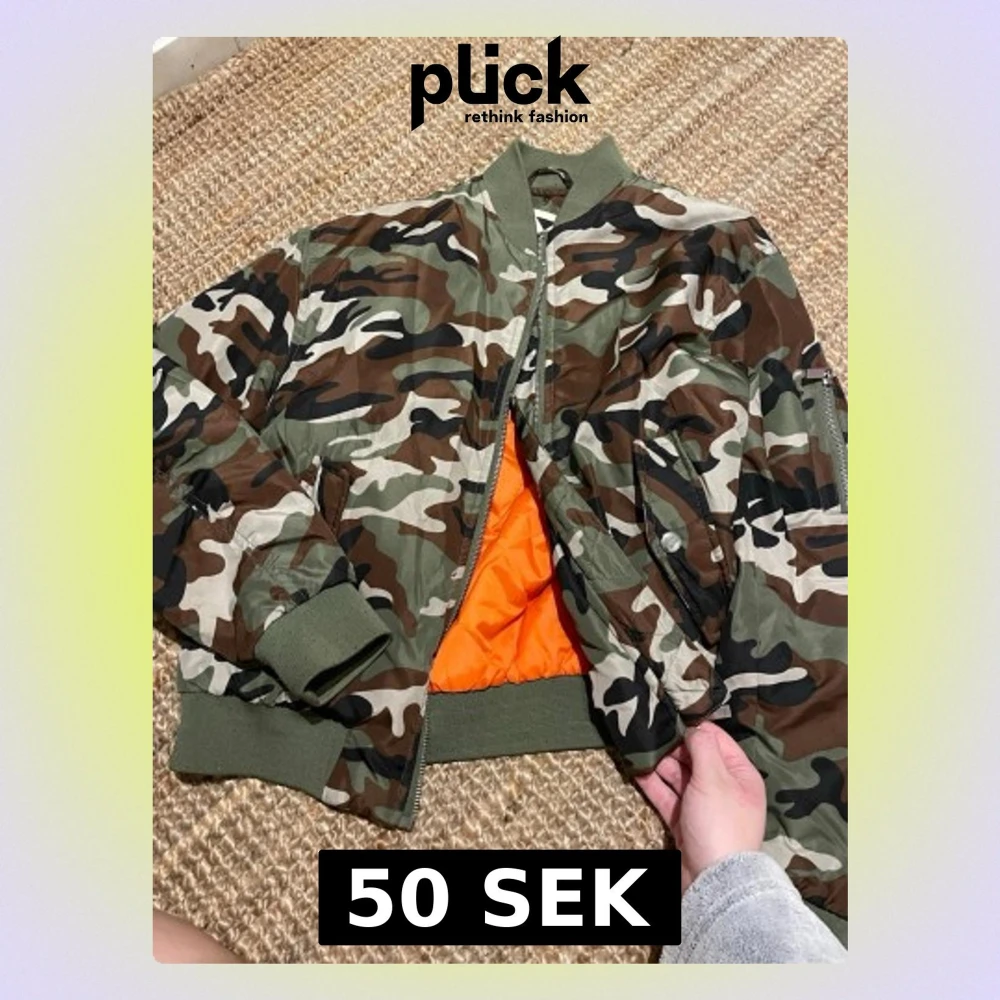 Säljer en camouflagemönstrad bomberjacka från Junkyard i storlek XS. Jackan har klassisk grön, brun och beige camo, orange innerfoder och ribbade muddar vid ärmar och midja. Två snedställda fickor framtill och ärmficka med dragkedja. Perfekt statement-plagg!