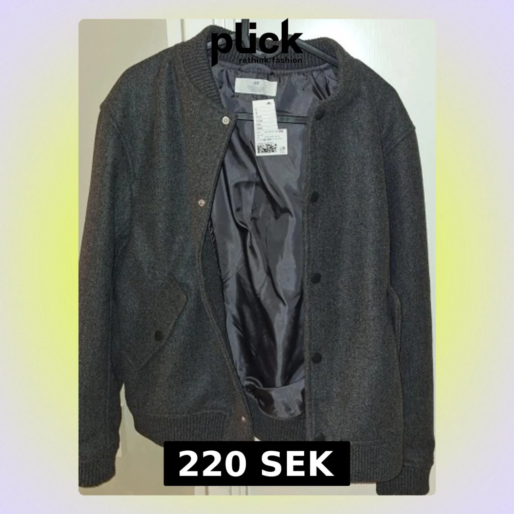 Stilren mörkgrå bomberjacka från H&M med ribbad krage, muddar och nederkant. Jackan har tryckknappar framtill och två snedställda fickor med lock. Materialet är en mjuk ullblandning med slät innerfoder för extra komfort. St 158