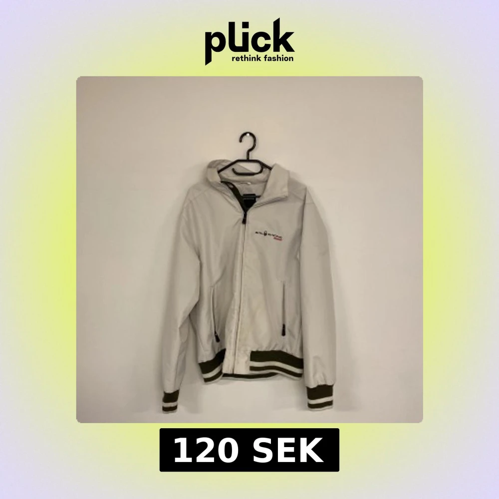 Snygg vit bomberjacka från Paul & Shark med dragkedja framtill, två fickor med svarta dragkedjor och broderad logga på bröstet. Den är lite smutsig men går säkert bort i tvätten