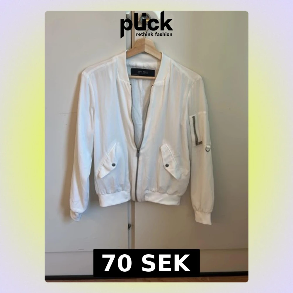 Snygg vit bomberjacka från Zara Basic med dragkedja framtill, två fickor med tryckknappar och en ärmficka med dragkedja. Jackan har ribbade muddar vid ärmslut och midja samt en klassisk bomberkrage. Materialet är tunt och ger en stilren look. Dragkedjan är lite dåligt men den fungera fortfarande.