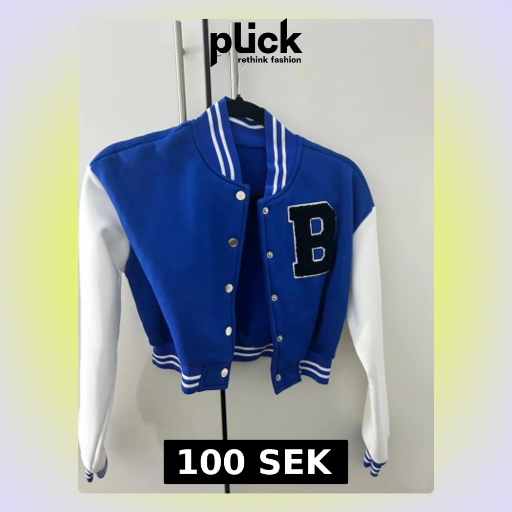 Snygg blå bomberjacka med vita ärmar och stora bokstaven B på bröstet. Jackan har ribbade muddar och krage med vita ränder, tryckknappar framtill och klassisk college-look. Perfekt för dig som vill sticka ut med en sportig och trendig stil.