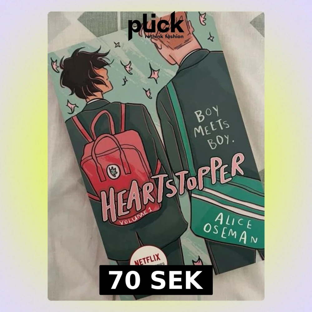 Säljer boken 'Heartstopper Volume 1' av Alice Oseman. Omslaget har en tecknad stil med två killar i skoluniform, en med röd ryggsäck och en med grön väska. Boken är på engelska och har inspirerat en Netflix-serie. Perfekt för dig som gillar romantik och grafiska romaner.