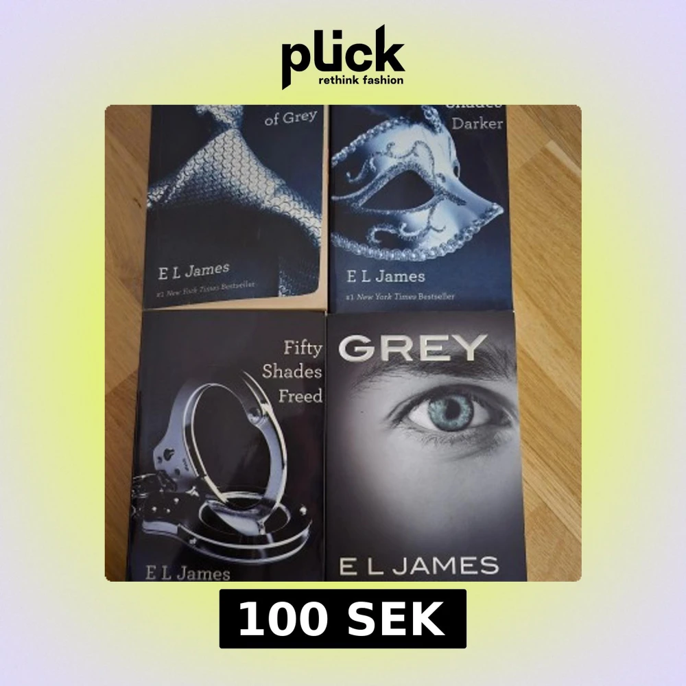 Samling av böcker från E L James, inklusive 'Fifty Shades of Grey', 'Fifty Shades Darker', 'Fifty Shades Freed' och 'Grey'. Omslagen har olika motiv som en mask, handbojor och ett öga, alla i en dämpad färgskala.