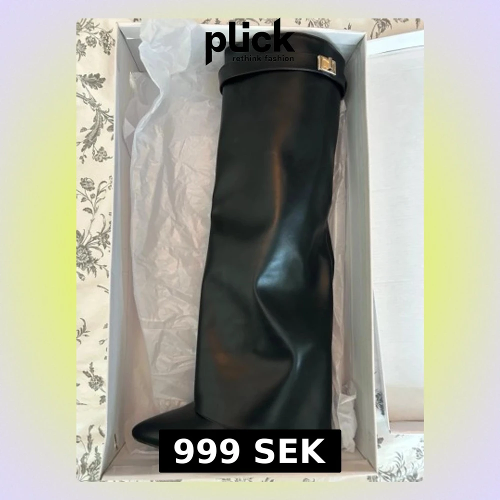 Säljer ett par svarta höga stövlar i slätt skinnimitation med spetsig tå och bred skaft. Stövlarna har en dekorativ rem med guldfärgat spänne upptill och en diskret kilklack. Perfekta för en edgy och trendig look. !!Använt dem en gång!!
