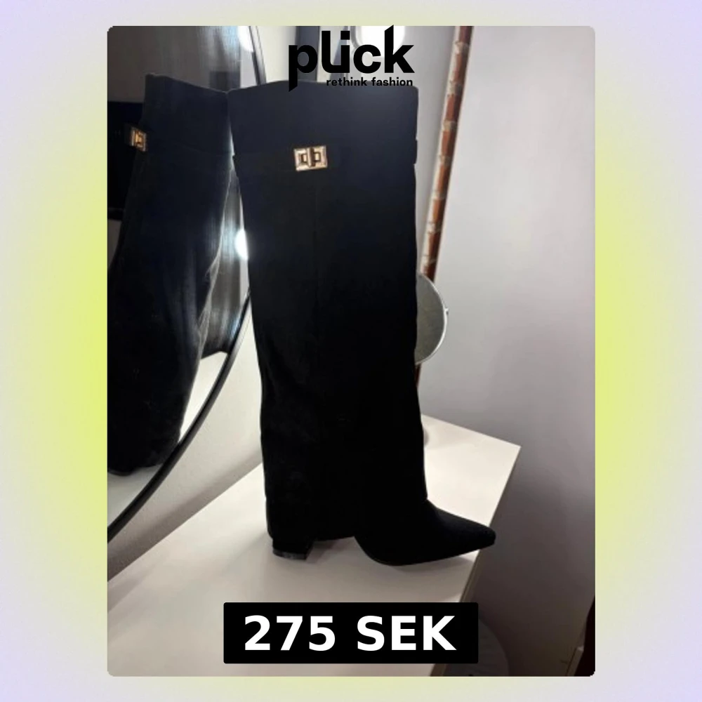 Säljer ett par svarta knähöga stövlar med spetsig tå och chunky klack. Stövlarna har en snygg gulddetalj upptill och är tillverkade i mockaimitation. Dragkedja på insidan för enkel påtagning. Perfekta för att lyfta vilken outfit som helst.