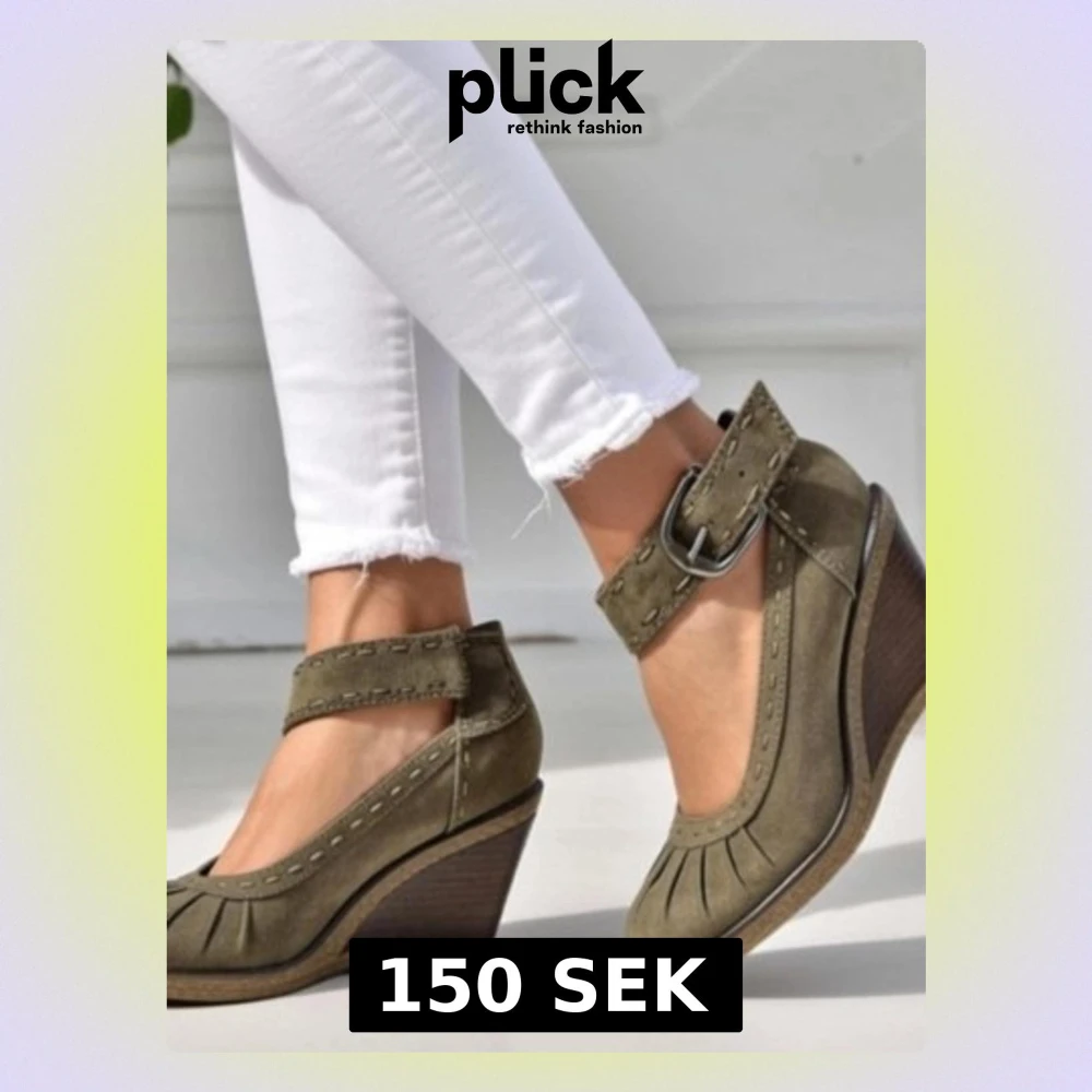 Snygga olivgröna kilklackar i mocka med dekorativa sömmar och justerbart spänne. Perfekta för höst och vår, dessa skor har en stabil kilklack och en bekväm passform. Insidan har ett mönstrat foder som ger extra stilpoäng. Perfekta för både vardag och fest!