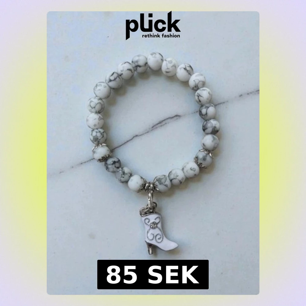 Snyggt armband med vita och gråmelerade pärlor, elastisk tråd och en charmig bootsberlock i vitt med silverdetaljer. Perfekt accessoar för dig som gillar unika detaljer och westerninspirerad stil.