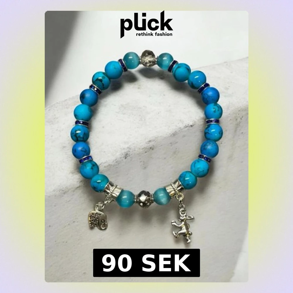 Snyggt armband med blå pärlor och silverfärgade detaljer. Armbandet har två berlocker, en elefant och en häst, samt små blåa mellanringar. Perfekt accessoar för dig som gillar färg och unika detaljer.