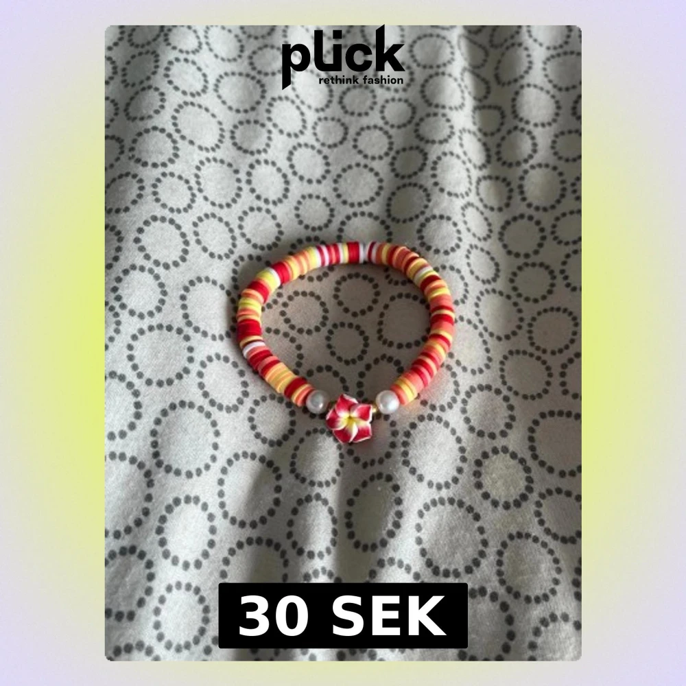 Armband med runda pärlor i rött, gult och vitt samt två större vita pärlor. I mitten sitter en dekorativ blomma i rött, vitt och gult. Elastiskt band gör det enkelt att ta på och av. Perfekt för dig som gillar färgglada accessoarer och unika detaljer.