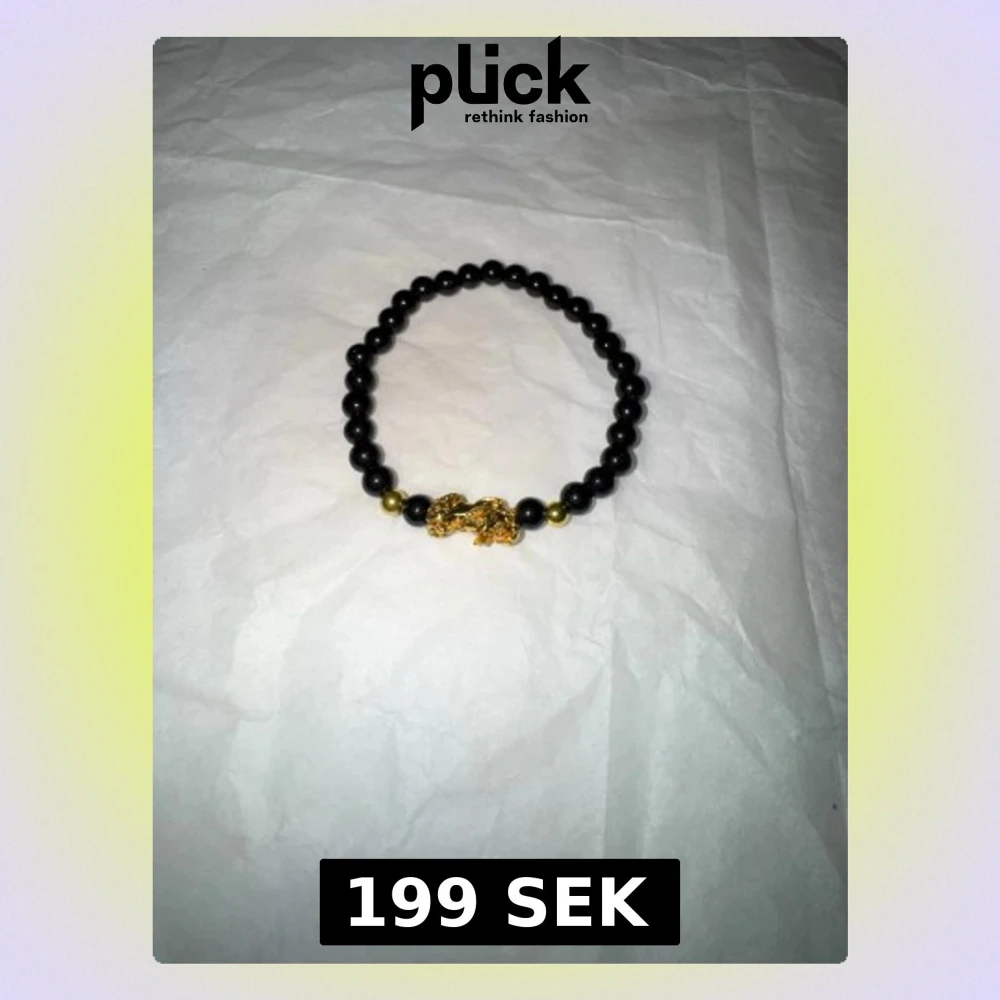 Snyggt armband med svarta pärlor och guldfärgade detaljer, inklusive en cool guldfärgad drakfigur i mitten. Perfekt accessoar för att lyfta din stil och ge en unik touch till din outfit. Elastiskt band gör att det passar de flesta handleder.