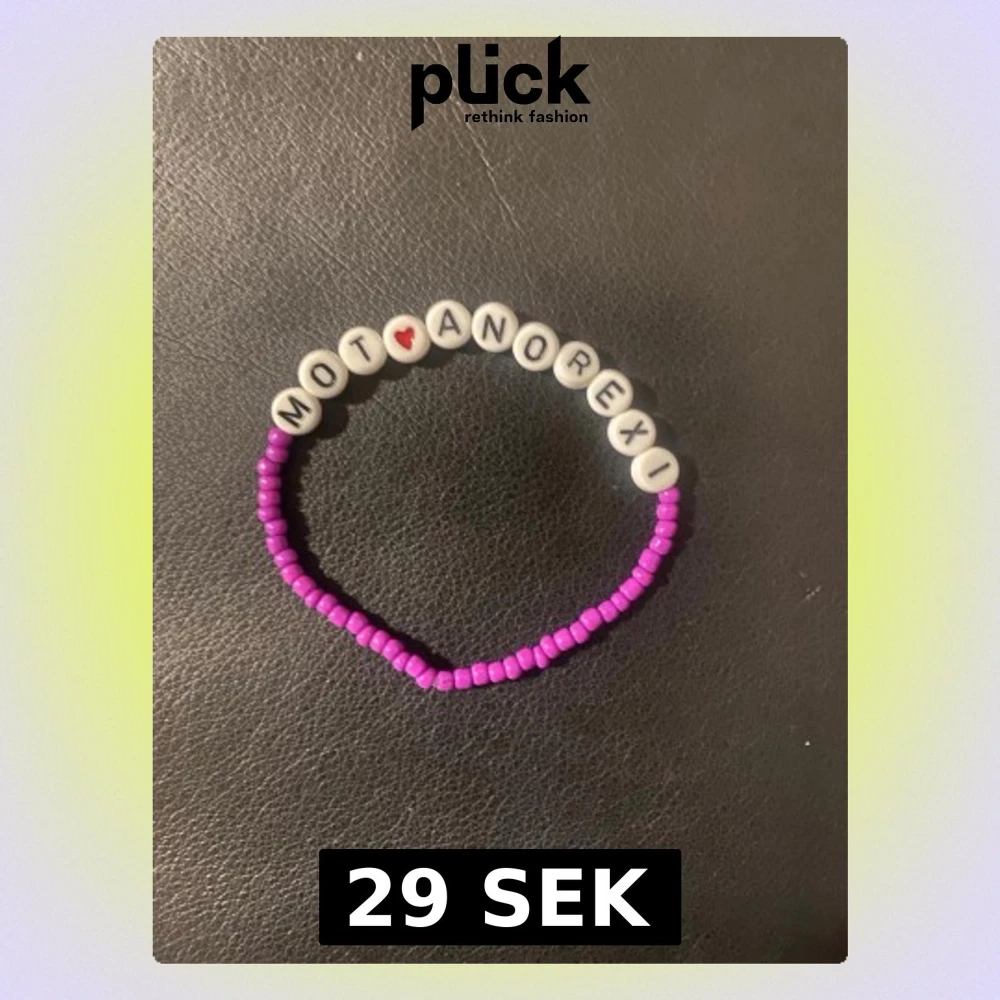 Ett handgjort armband med små lila pärlor och vita bokstavspärlor som stavar 'MOT ANOREXI' med ett rött hjärta. Armbandet är elastiskt och passar de flesta handleder. Perfekt för dig som vill bära ett statement och sprida ett viktigt budskap.