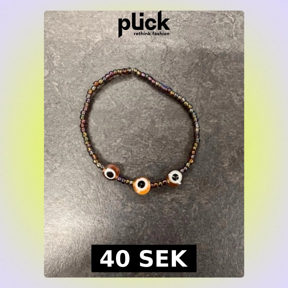 Ett handgjort armband med pärlor i olika mörka färger och tre större ögonpärlor.