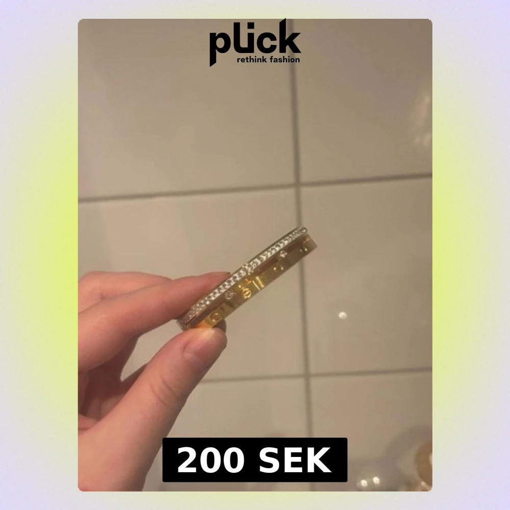 Snyggt guldigt armband i metall med gnistrande stenar längs kanten. Armbandet har en stilren och modern design med små skruvdetaljer runt om. Perfekt accessoar för att lyfta din outfit.
