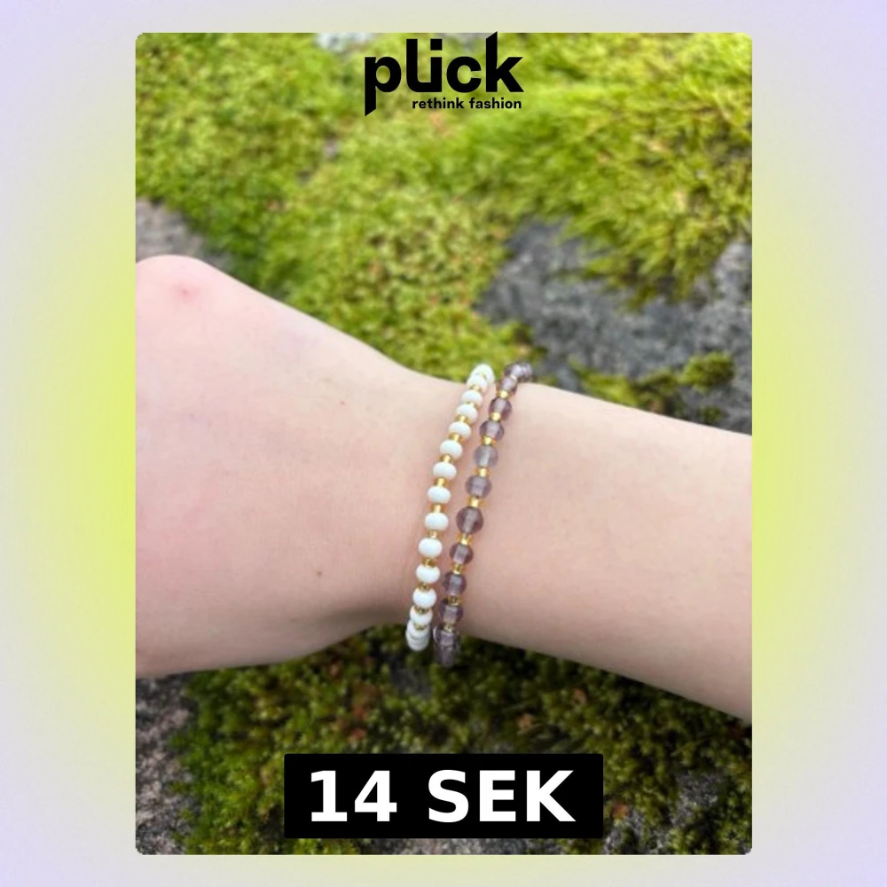 Säljer två stretchiga armband med små pärlor. Ett armband har vita pärlor och det andra har genomskinliga lila pärlor. Perfekta att bära tillsammans eller var för sig för en enkel men snygg look.