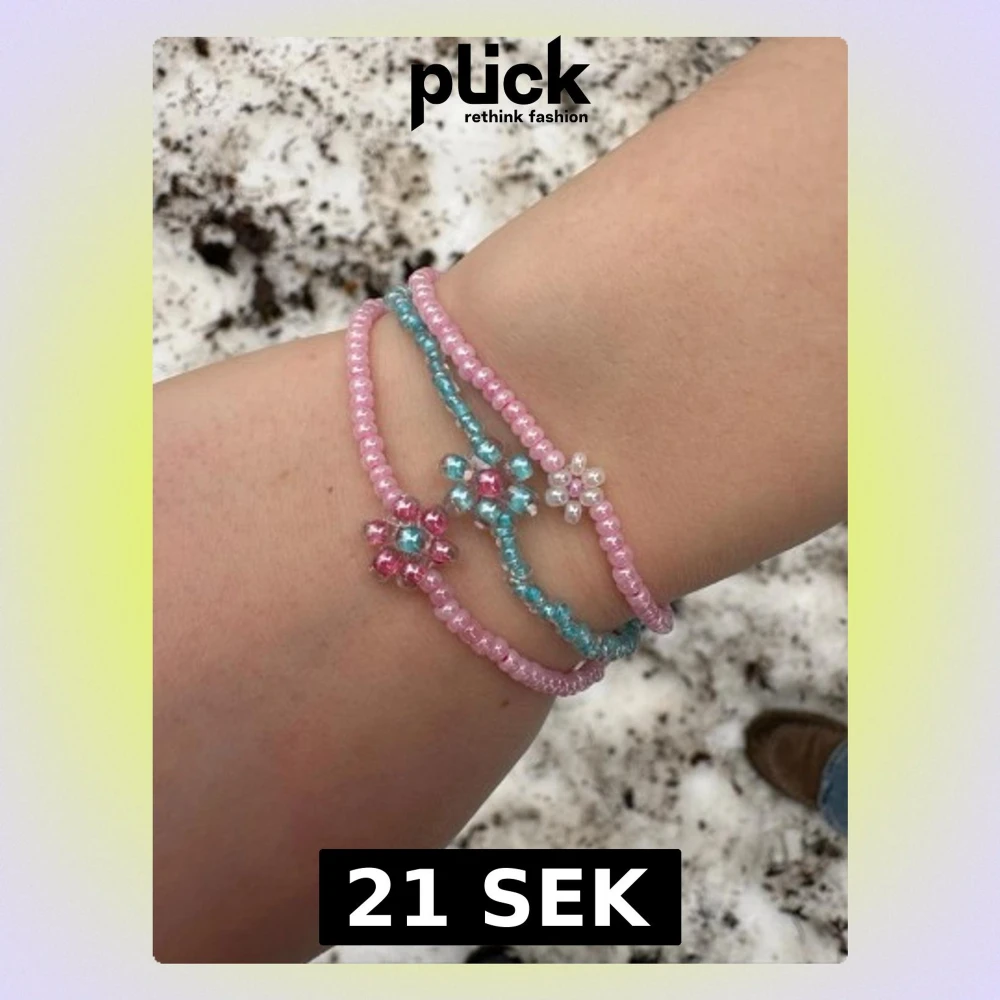 Tre handgjorda armband med små pärlor i rosa, blått och vitt. Varje armband har en söt blomdetalj av pärlor i matchande färger. Perfekta för att ge din outfit en gullig och färgglad touch. Elastiska och lätta att ta på.