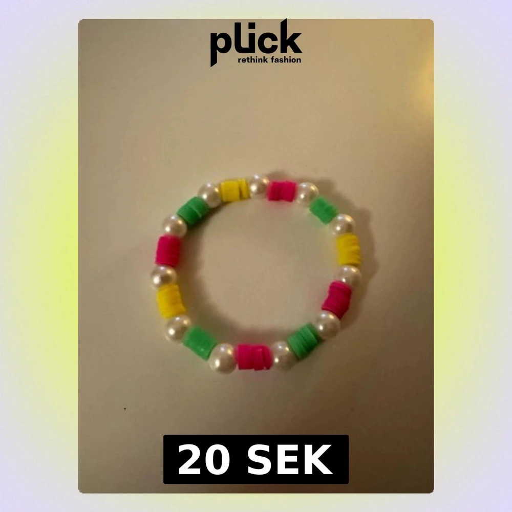 SÀljer ett fÀrgglatt armband med vita pÀrlor och platta neonfÀrgade pÀrlor i rosa, grönt och gult. Armbandet Àr elastiskt och passar de flesta handleder. Perfekt accessoar för dig som gillar lekfulla och trendiga smycken.