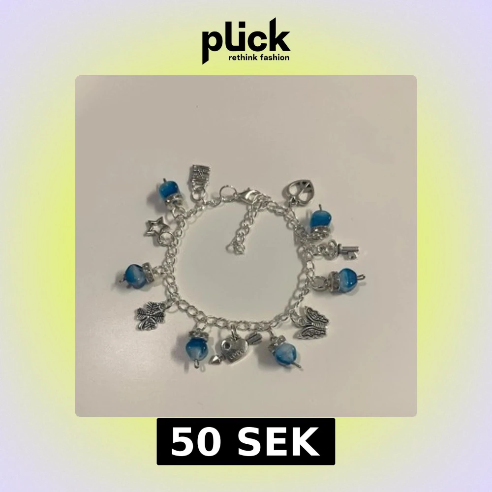 HANDGJORT armband i silverfärg med flera olika berlocker. Armbandet har blå pärlor som ger en färgklick och kedjan är justerbar.