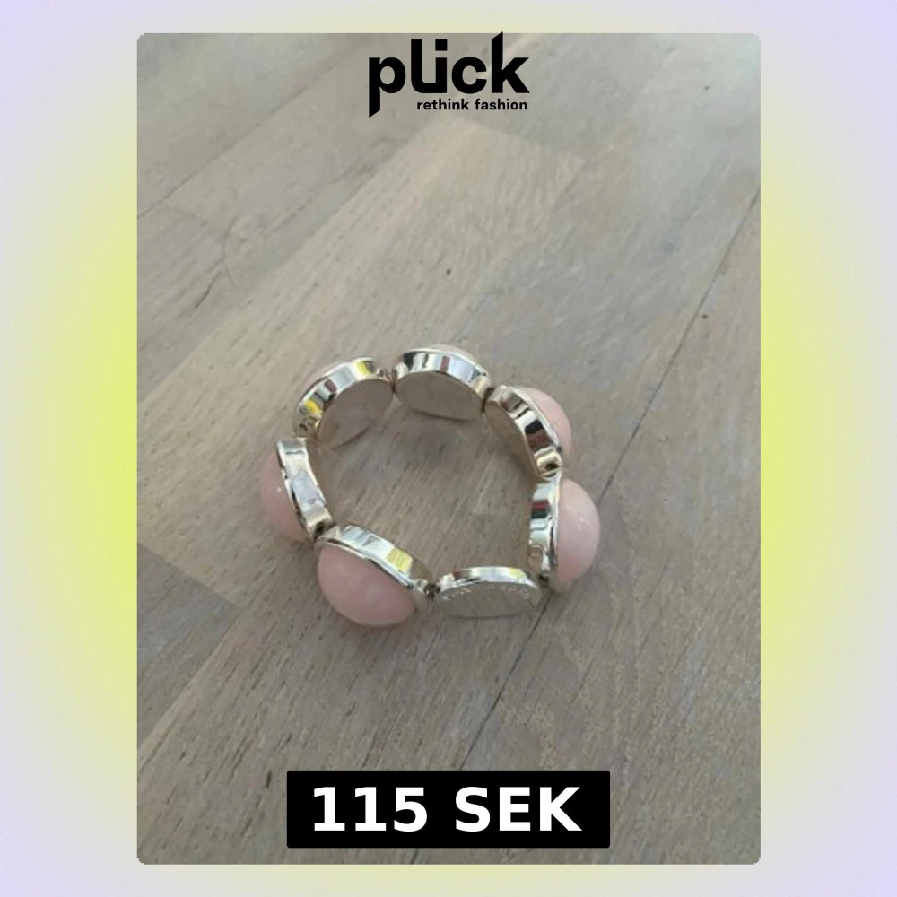 Snyggt armband med stora, ljusrosa pärlor infattade i silverfärgade metallramar. Märkt SONS OF SWEDEN på baksidan. Armbandet har en rund form och elastisk tråd som gör det enkelt att ta på och av.