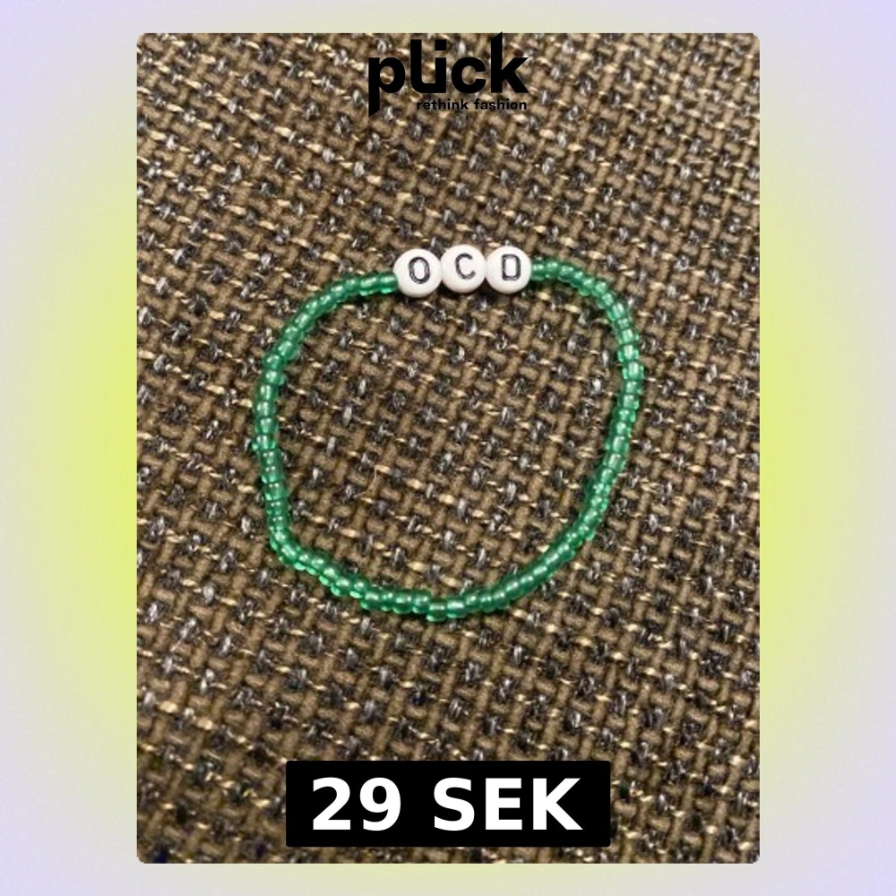 Ett handgjort armband med små gröna pärlor och tre vita pärlor med svarta bokstäver som stavar 'OCD'. Armbandet har en enkel och ungdomlig design, perfekt för dig som gillar personliga accessoarer.