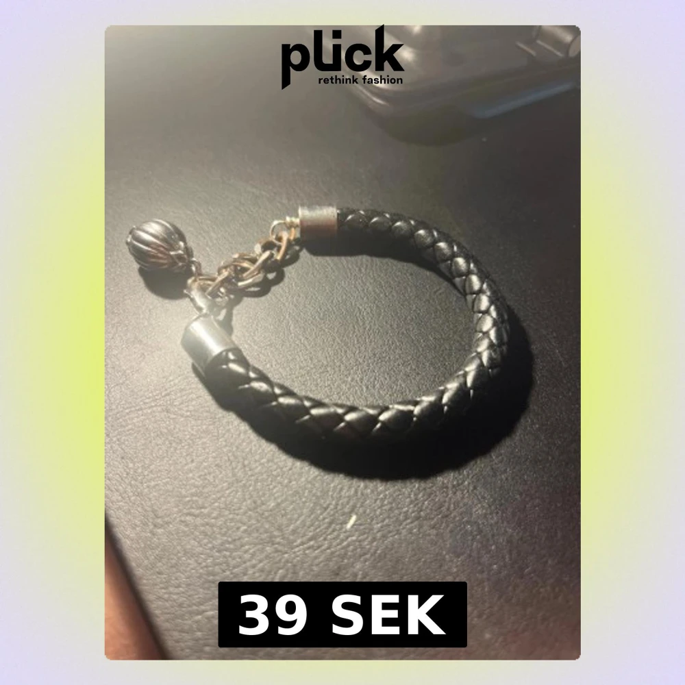Snyggt svart armband i flätat läder med silverfärgade metalldetaljer och en rund berlock. Armbandet har en enkel kedja och stängning i metall. Perfekt accessoar för en stilren look.