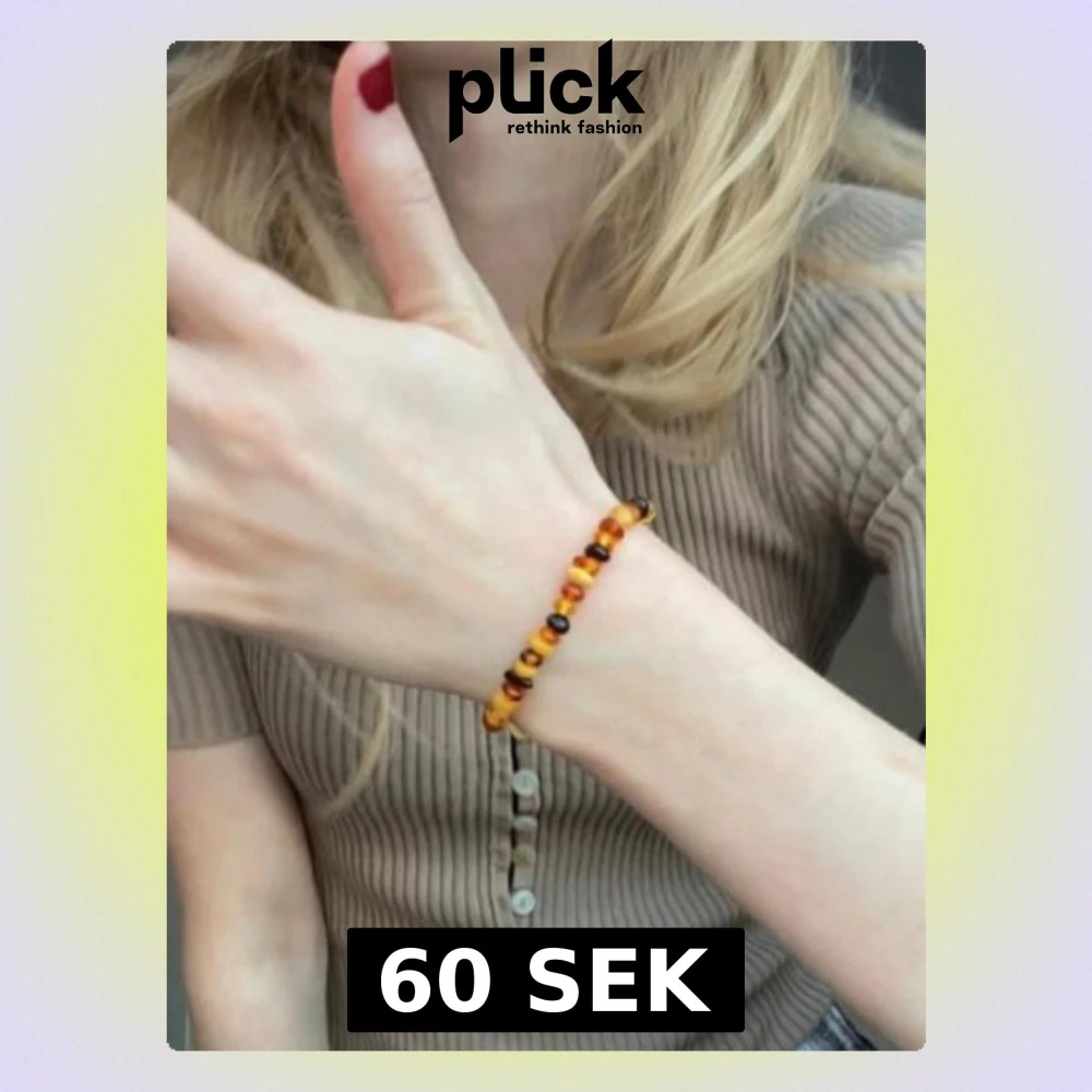 Ett handgjort armband av äkta bärnsten i både ljust och mörkt. Pärlorna är ganska rundade och sitter på en elastisk tråd som gör armbandet lätt att ta på och av. Såå snyggt och ger verkligen en retro/vintage stil. Älskar att matcha det med andra armband. NOTERA jag har rätt liten handled så skulle säga att det är storlek XS.