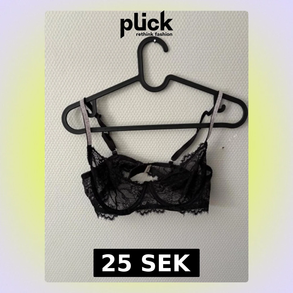 Säljer en svart bh i genomskinlig spets med dekorativa strassband som axelband. Bh:n har bygel och ett litet hål framtill för extra detalj. Justerbara axelband och hakknäppning bak. Perfekt för dig som gillar en trendig och elegant look.